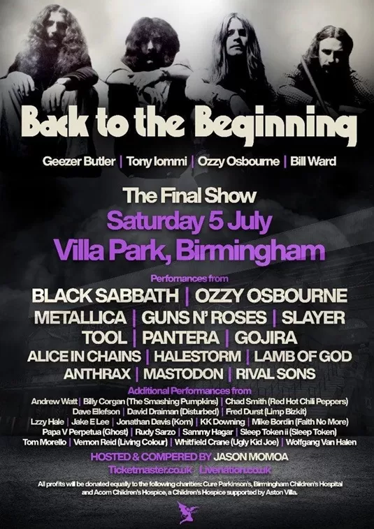 El último show de la historia de Black Sabbath y de Ozzy Osbourne, titulado Back to the Beginning, agotó todas las localidades en cuestón de minutos. El mismo se llevará a cabo en Villa Park de Birmingham el próximo 5 de julio. La banda formará con su formación inicial, integranda por Ozzy, Tony Iommi, Geezer Butler y Bill Ward. Además del número principal, también se presentarán Metallica, Guns N’ Roses, Tool, Rival Sons, Slayer, Pantera, Gojira, Alice In Chains, Halestorm, Lamb Of God, Anthrax, Sammy Hagar, Mastodon y Tom Morello, entre otros invitados. Este último será el director musical del evento.