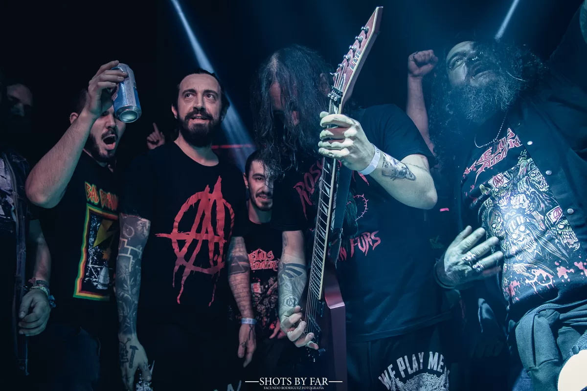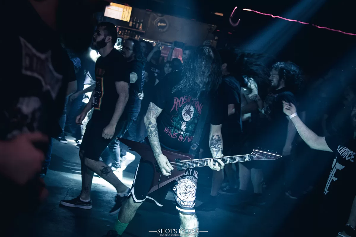 Tras aquellos dos temas y con la banda sin menguar energía pero intercambiando cervezas, la entrega de Angelus Apatrida se vuelve total. Guillermo agarra una vez más el micrófono, pero esta vez, para proponer algo: “Davish quiere bajar a tocar un tema con ustedes… a ver si le hacen espacio”. El guitarrista se baja del escenario y entre aplausos, gritos y vitores, se ubica en el centro del recinto. La masa lo rodea, la expectativa es absoluta. El frenesí que está por desatarse se palpita. Entre colegas, nos sonreímos, porque sabemos que estamos a punto de atestiguar algo que no se vió en todo el año, ni siquiera en los shows más grandes. “Denle espacio, de eso se trata. Give’em War!” escuchamos detrás de nosotros, atentos a David y sus fanáticos. La procesión comienza, la marcha es lenta, pero toma ritmo.
