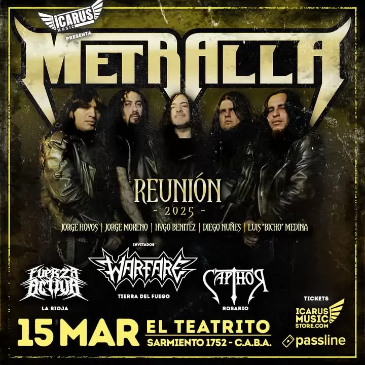 La legendaria banda nacional liderada por Hugo Benitez regresa a las tablas. Será en una reunión única para los amantes de este estilo a la vieja escuela, organizada por Icarus. El evento se llevará a cabo el próximo 15 de marzo en El Teatrito, ubicado en Sarmiento 1752 (C.A.B.A.) a partir de las 19 hoas. Las bandas que abrirán el show de Metralla serán Fuerza Activa, Captor y Warfare.