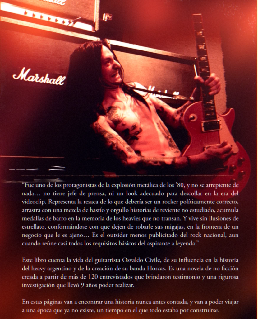 Se trata de una novela de carácter enteramente narrativo, en clave noir, que seguirá a Osvaldo a lo largo de su historia. Pero no es solo eso. El relato tratado va y viene en el tiempo, reconstruyendo la historia de Horcas, y de todo el heavy metal argentino a lo largo de 40 años, período que en la obra lleva el título de «Las Guerras Heavys». Les aseguramos, tras leer los primeros capítulos, que jamás leyeron al metal como lo leerán en este libro. Además, está escrito de tal forma, que aquel que pertenezca al pueblo metalero, se sentirá identificado, y quien no conozca siquiera a Osvaldo, podrá conocerlo sin ningún problema.
