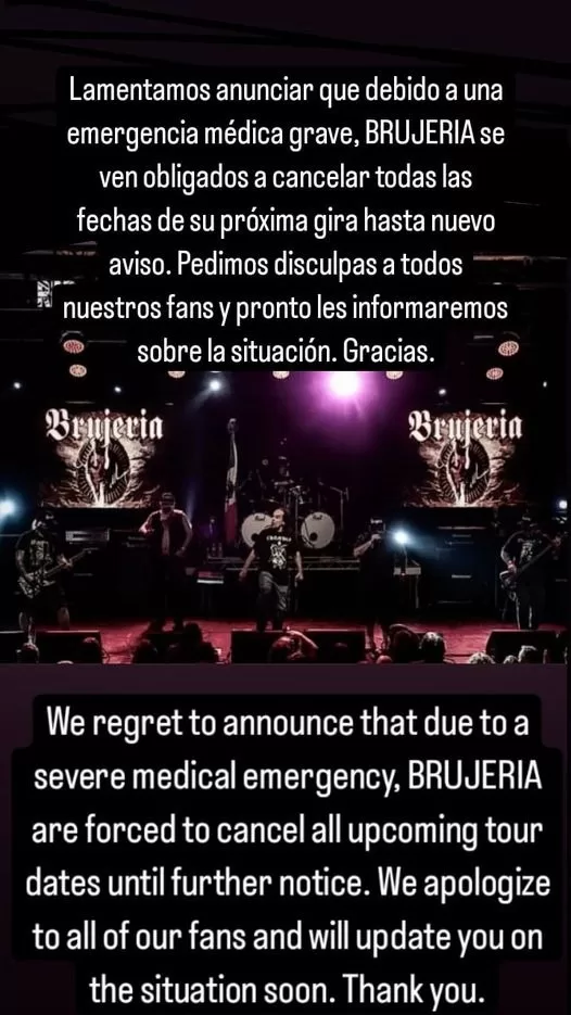 Los veteranos del grindcore han tenido que cancelar todas sus presentaciones debido a serios problemas de salud de uno de sus integrantes. En un comunicado lanzado en las últimas horas, la banda ha publicado la siguiente declaración a través de las redes sociales: «Lamentamos anunciar que debido a una grave emergencia médica, Brujería se ve obligada a cancelar todas las próximas fechas de la gira hasta nuevo aviso. Nos disculpamos con todos nuestros fans y les actualizaremos sobre la situación pronto. Gracias”.