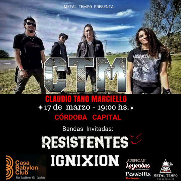 Uno de los guitarristas más importantes de la escena rockera y metálica nacional llega a la ciudad mediterránea. De la mano de Metal Tempo Producciones, Claudio Tano Marciello se presentará el domingo 17 de marzo en Casa Babylon, el clásico recinto ubicado en Bv. Las Heras 48 (Viejo Abasto). La cita es a las 19 horas, y contará con la llegada también desde Buenos Aires de Resistentes, la super banda conformada por José Velocet, Walter Scasso, Ricky «el Griego» Alonso y «el Chino» Barret. La agrupación telonera local será Ignixión, del Valle de Punilla.