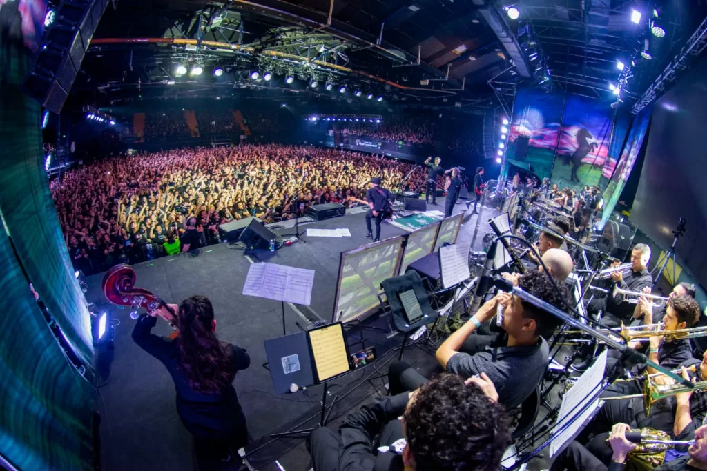El segundo acto marcó el ingreso de la Orquesta Sinfónica Binaural. Mientras se proyectaba un video del Tano en la Ruta 76 llegando a un monolito con las inscripciones “Almafuerte, Iorio, Hermética, V8”, fue imposible no sentir un nudo en la garganta. La orquesta entró justo al terminar ese pasaje y lo que siguió fue una de las fusiones más emotivas de la velada. “Mi credo”, “Trillando la fina” y “Almafuerte” sonaron con fuerza renovada, casi cinematográfica. En medio del set, el Tano dijo que quería trabajar con ellos en el futuro y pidió estar atentos a redes. Luego llegó “El Visitante”, con un video introductorio sobre los pilotos de Malvinas que generó ovación generalizada. “Muere Monstruo Muere” mantuvo la intensidad. “Sentir Indiano”, “Yo Traigo la Semilla” y “Convide Rutero”, con Radaelli, mostraron que el bajista puede manejar ese repertorio con respeto. “Del Entorno”, “Homenaje” (con la historia del gaucho Augusto Romero), “Niño Jefe” y “Ceibo” cerraron el segundo set pasadas las 22:30. El Tano preguntó si estábamos conformes para seguir. La respuesta fue obvia: nadie se movía