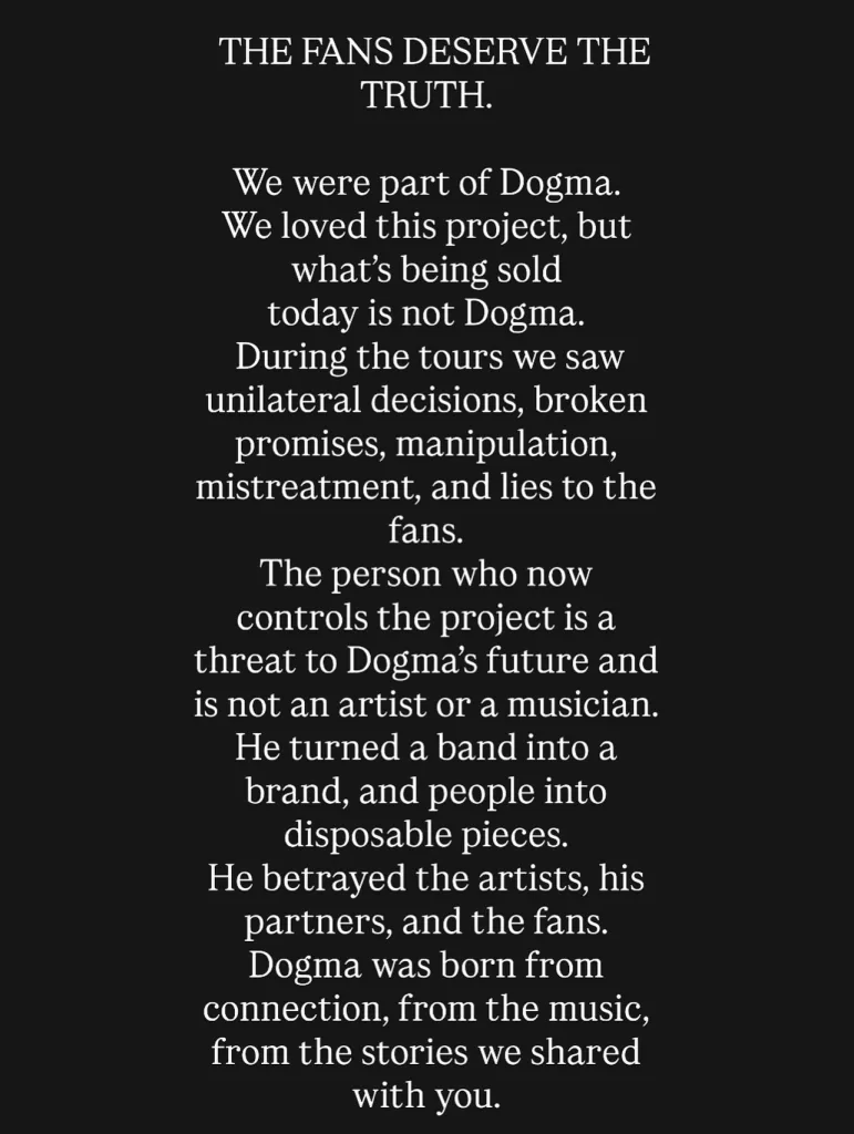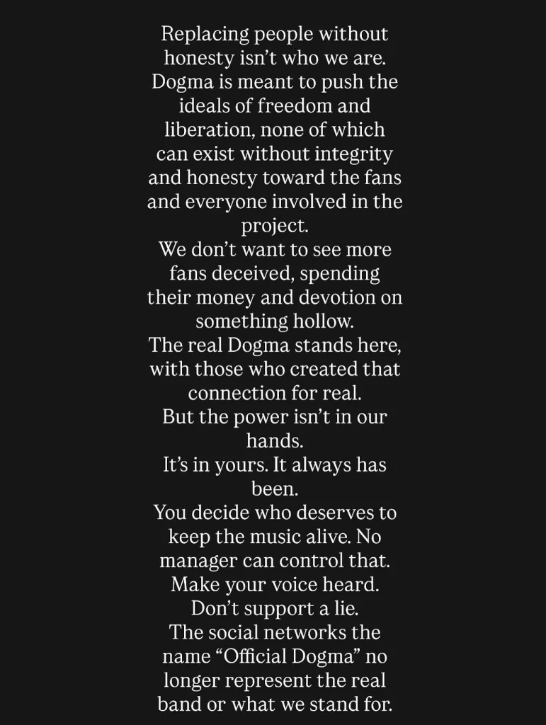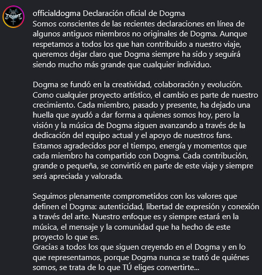 “Somos conscientes de las recientes declaraciones en línea de algunos antiguos miembros no originales de Dogma. Aunque respetamos a todos los que han contribuido a nuestro viaje, queremos dejar claro que Dogma siempre ha sido y seguirá siendo mucho más grande que cualquier individuo. Cada miembro, pasado y presente, ha dejado una huella que ayudó a dar forma a quienes somos hoy… Estamos agradecidos por el tiempo, energía y momentos que cada miembro ha compartido con Dogma”.