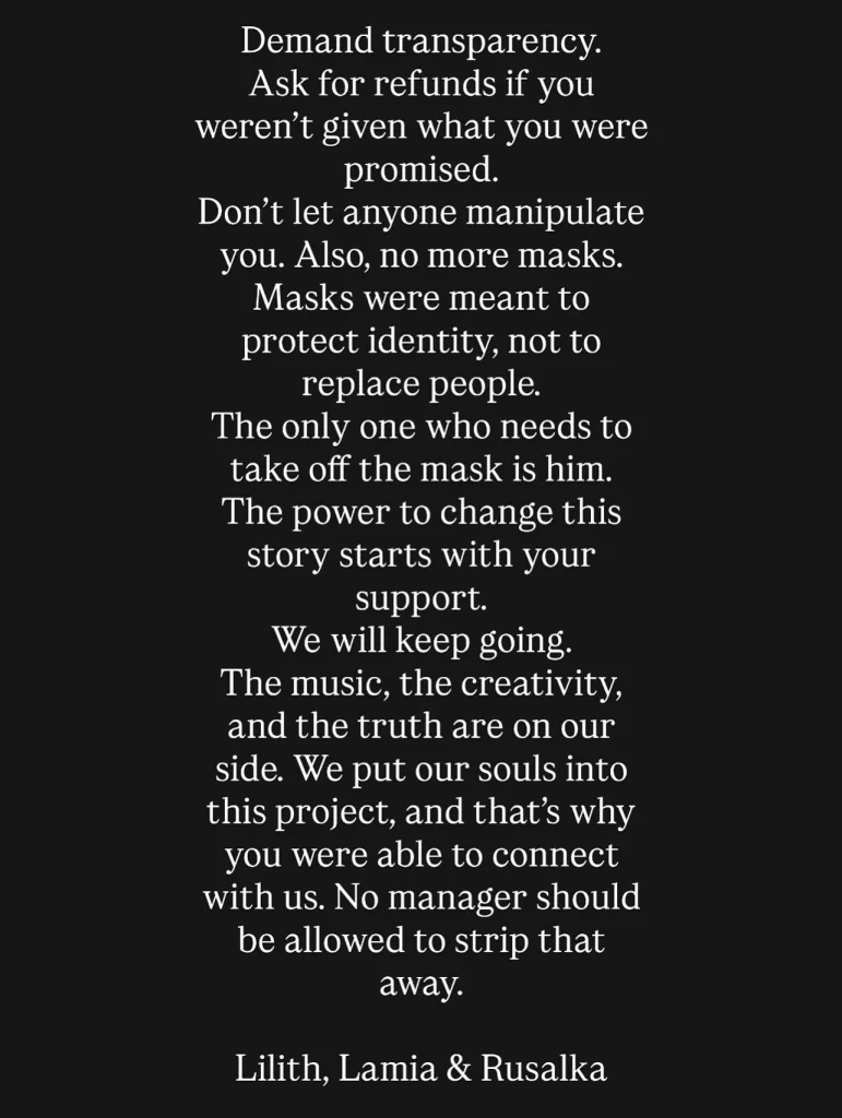También remarcaron que su salida no estuvo vinculada a conflictos personales entre ellas, sino a factores externos relacionados con la dirección artística y la gestión del proyecto. En uno de los pasajes más contundentes, añadieron: “No podemos seguir siendo parte de algo en lo que ya no se nos permite decidir ni crear libremente”.