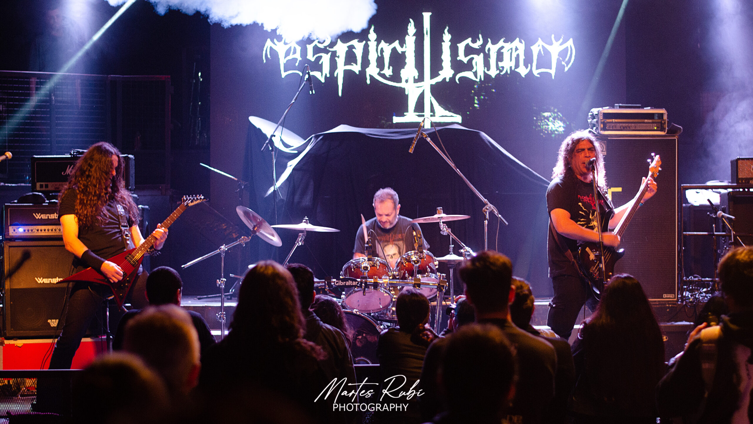 Son las 19.40 y el telón del escenario se cierra. Estamos a la espera de la segunda banda de la noche, los chicos de Terror en camino negro, quienes finalmente salen a escena a las 19.56. Todos vestían túnicas y capuchas, un gran vestuario para una banda que transmitió, durante todo su show, una mística de ocultismo y magia negra. Las animaciones que se proyectaban en el telón de fondo, con magos negros en contubernio oscuro, le agregaban a las melodías osucuras de la banda una atmósfera realmente envolvente. Se extasió el público, ya ora más concurrido, con la interpretación del tema de la película “El exorcista”. Cerró su presentación con su séptimo tema, “Marruco”, a las 20.25, con una gran potencia que prendió al máximo la expectativa de la noche.