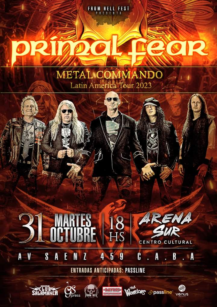 La banda alemana de Heavy Power Metal Primal Fear se estará presentando en nuestro país en el mes de octubre. Será el martes 31, desde las 18 horas, en el Centro Cultural Arena Sur (Av. Saenz 459 – C.A.B.A.). Aun no ha trascendido qué bandas nacionales podría ser parte de el evento.