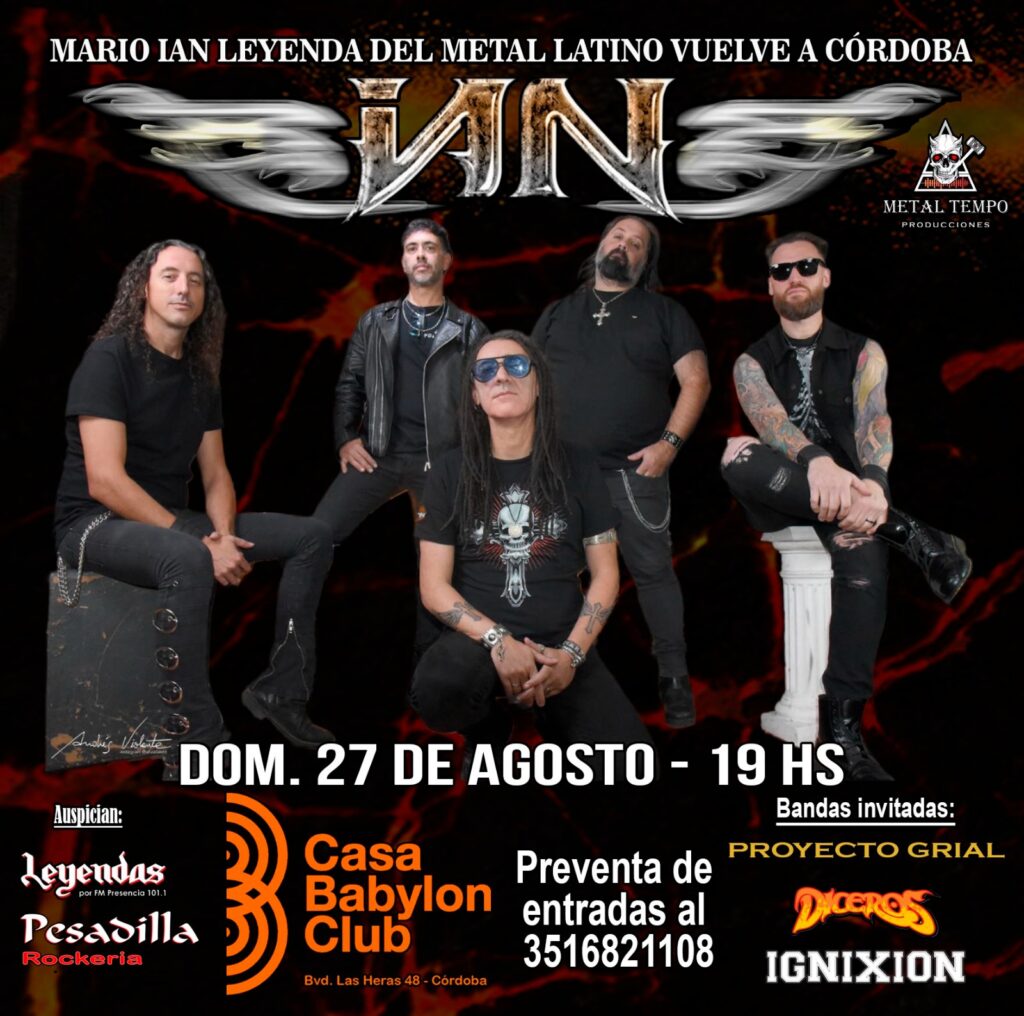 La banda de Mario Ian, uno de los vocalistas más importantes de la escena del Heavy Metal latinoamericano, llega a la ciudad de Córdoba. Será el domingo 27 de agosto en Casa Babylon, local ubicado en Bv. Las Heras 48 (Viejo Abasto). La cita es a las 19 horas en punto, y las bandas locales que abrirán la noche serán Proyecto Grial, Ignixion y Díceros.
