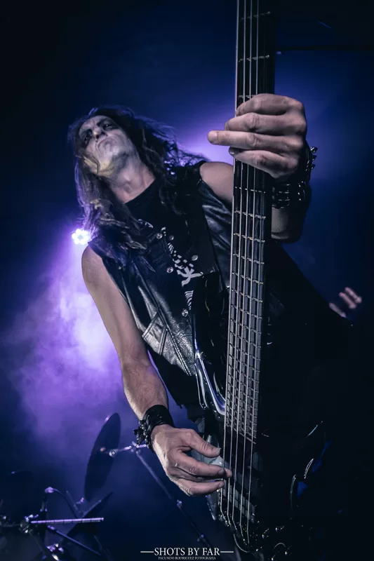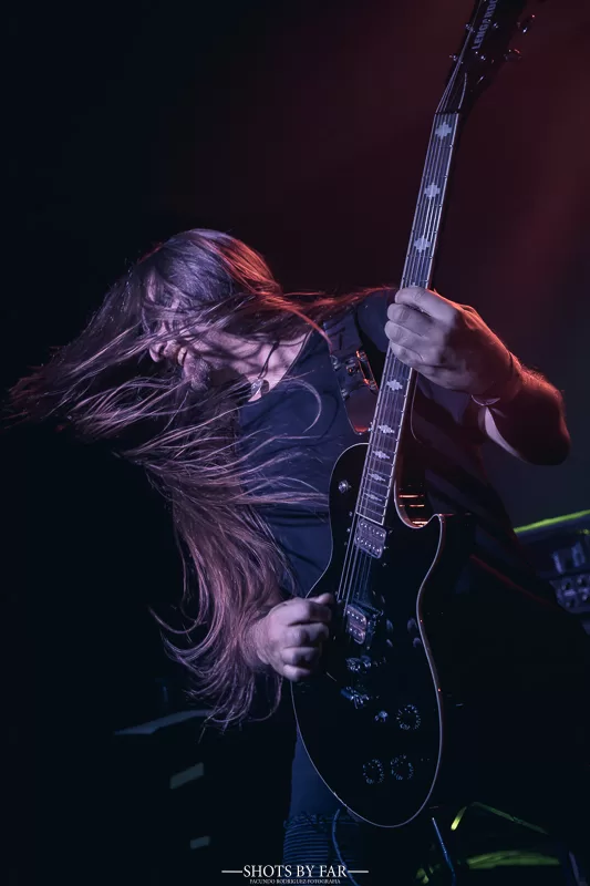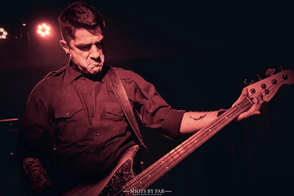 El escenario se tiñe de una penumbra azulina, apenas rota por los destellos rojos de los estrobos que marcan los pasajes más extremos. La figura del vocalista se impone con autoridad, mientras la banda despliega un sonido ciertamente sólido y compacto, sin fisuras, donde cada instrumento encuentra su lugar en un muro sonoro envolvente.