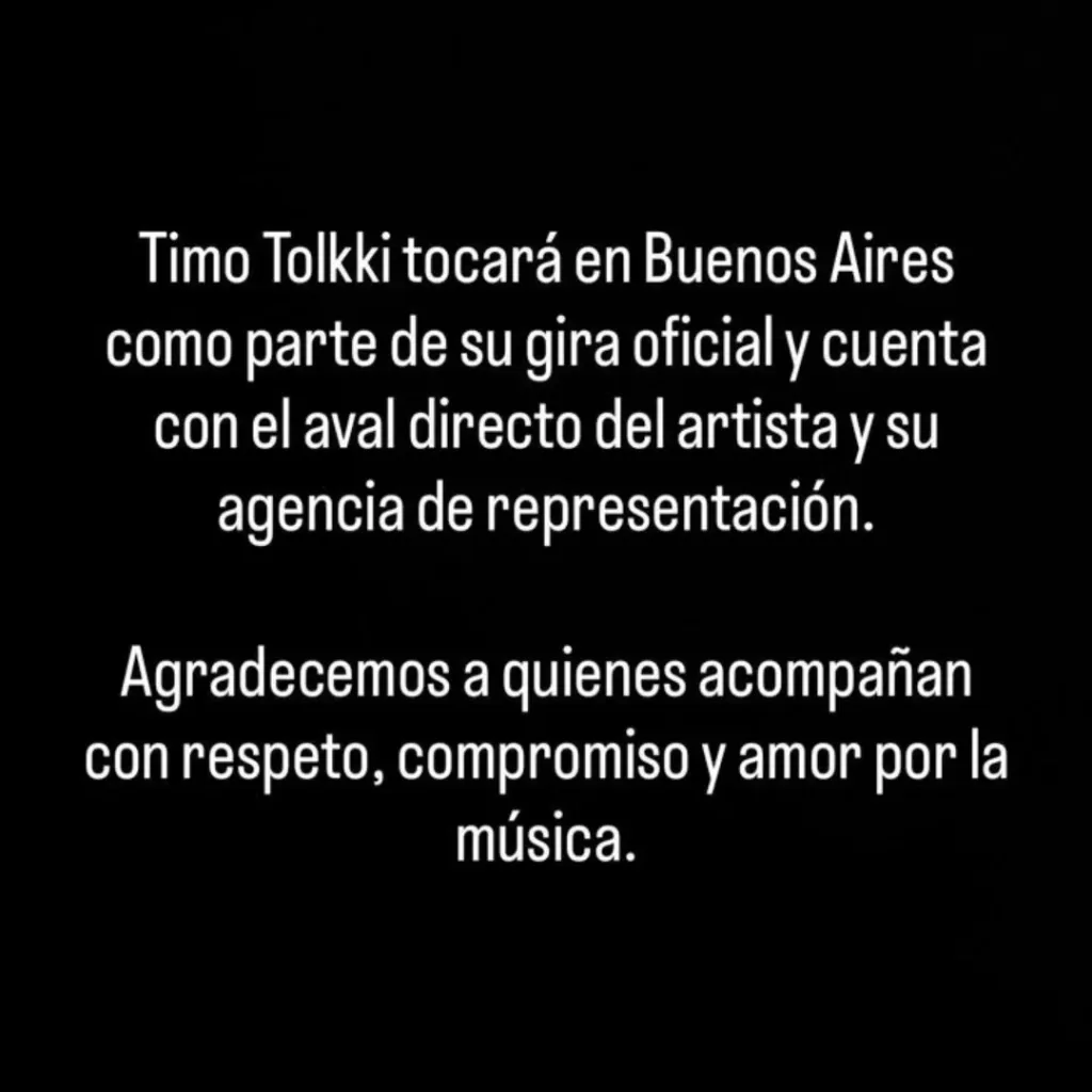 Tanto fue el lío, que hasta Tolkki compartió el intento de sabotaje en sus redes. Lo acompañó con el siguiente texto: «Hay un intento de sabotaje del show en Buenos Aires. El mismo ocurrirá como está planificado. La cancelación inoportuna de marzo fue por razones médicas. El promotor está obligado a reembolsar el dinero de los tickets vendidos. Por favor, contactenlo para esto. ¡Nos vemos pronto!»