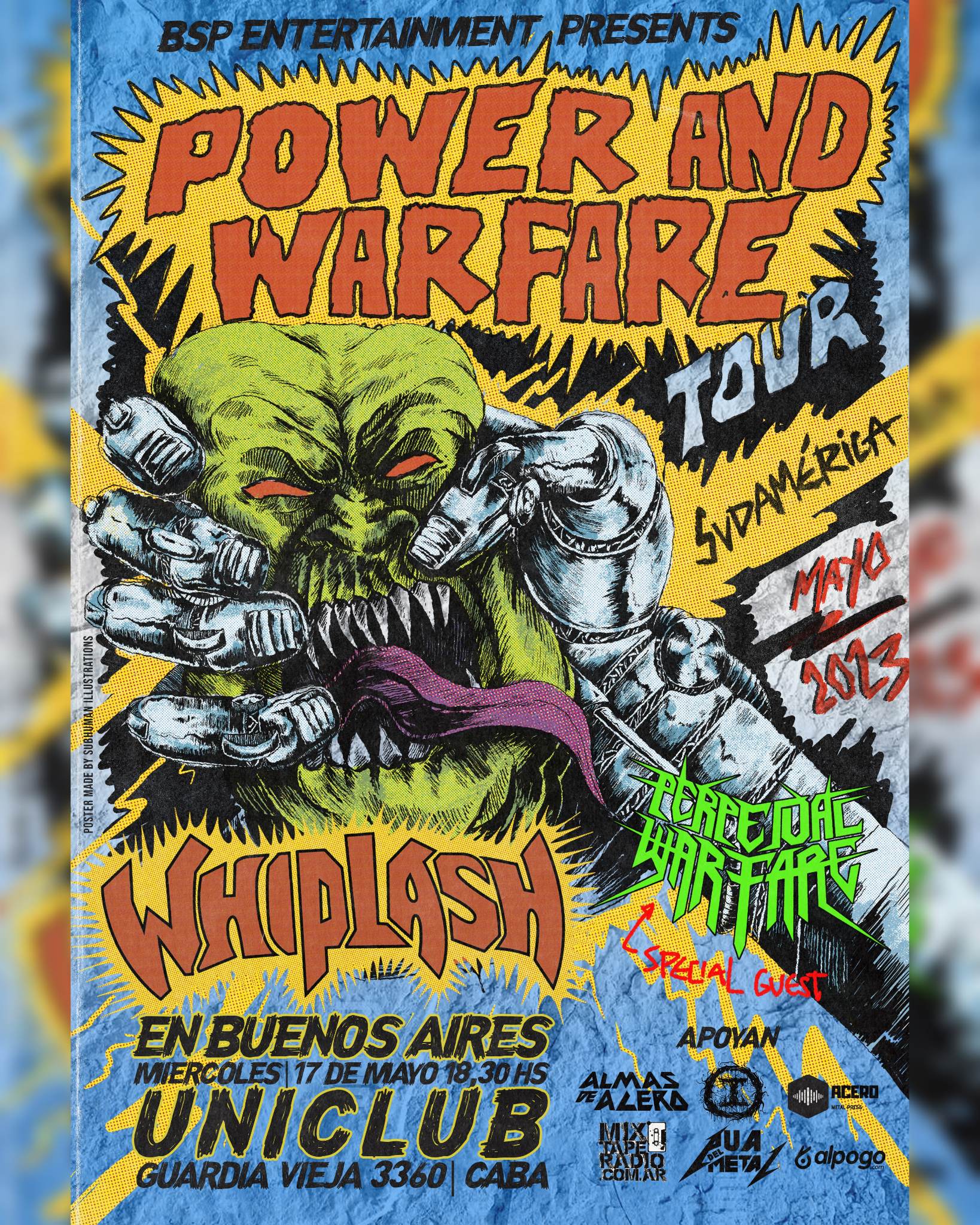 Desde la productora también añadieron que llegarán acompañados por la banda colombiana Perpetual Warfare, fundada en 2006 en Bogotá con tres discos larga duración en su haber, y considerada una de las revelaciones del Thrash Metal sudamericano. Para nuestro país las entradas están disponibles a través de https://alpogo.com/evento/whiplash-en-argentina-10230, desde los $8.000,y a la brevedad se darán a conocer los puntos de venta oficial de entradas físicas.